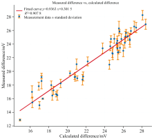 使用式(3)将不同激发光条件下获得的图像用来计算预测的电压差, 并将得到的预测值作为点的横坐标; 同时, 在两种激发条件下分别进行了五次IV测量, 由此确定的两种激发光条件下的开路电压差作为对应点的纵坐标, 从而得到如图4所示的蓝色的数据点, 由测量带来的误差使用橙色的误差棒表示。 不同激发条件下捕获的图像根据式(3)计算出的电压差与通过电压表测量的电压差进行了线性拟合, 拟合结果如图4 红色直线所示。 可以观察到, 测量的电压差与通过实验系统捕获图像所推导出的电压差之间表现出较好的线性相关性。 总体而言, 上述发光数据与端子电压测量之间的对比表明, 可以利用光致发光数据对光伏电池电压进行定量分析, 从而验证了使用本实验系统进行光致发光成像用于光伏电池质量检测的可行性。