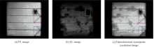 从图5和图6可以明显看出PL成像更适合检测划痕等缺陷, 而EL更适合检测电接触不良以及助焊剂等污渍残留缺陷。 可以考虑将PL和EL结合, 即光电协同激发, 以提升对多种缺陷检测的能力。 图7(a)展示了电池片的PL图像, 其中红色和蓝色框标出的为划痕或者裂缝缺陷, 绿色框标出的为电池片材质引起的黑斑缺陷。 图7(b)为对应的EL图像, 图中除绿色框出的黑斑之外, 存在其他大量的PL图像中不存在的黑色斑块, 因此可以确定其他的黑色斑块与绿色框起来的黑斑不同, 它们可能是由于助焊剂等污渍残留导致的缺陷。 此外, 蓝色框起来的部分为全黑, 与红色框起来的部分明显不同, 可以确定蓝色框起来的为裂缝, 红色框起来的为划痕。 图7(c)是光电协同激发图像, 图中两种黑色斑块以及划痕与裂缝的灰度值明显有区别, 结合了PL和EL的优点, 并且进一步印证了由图7(a)和(b)得出的结论。