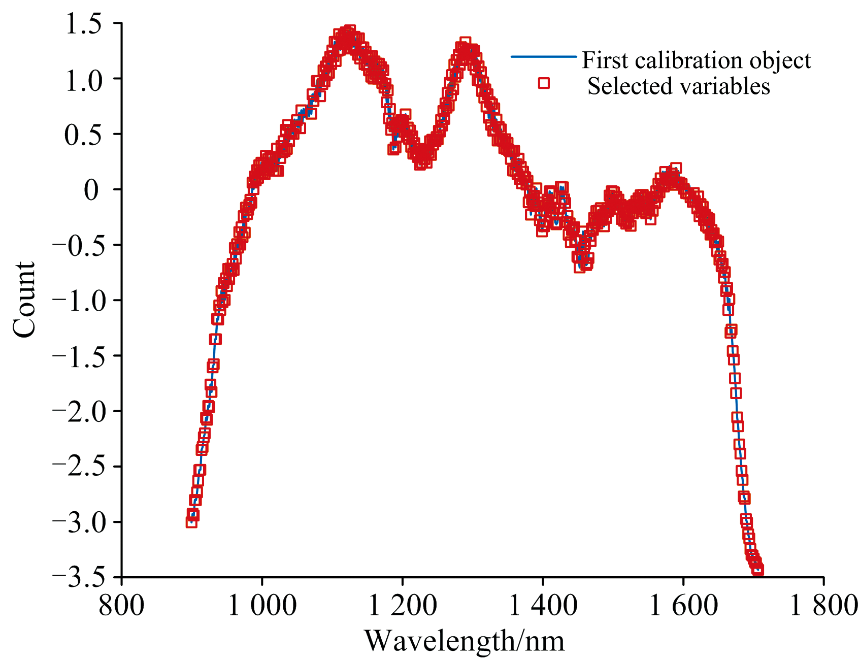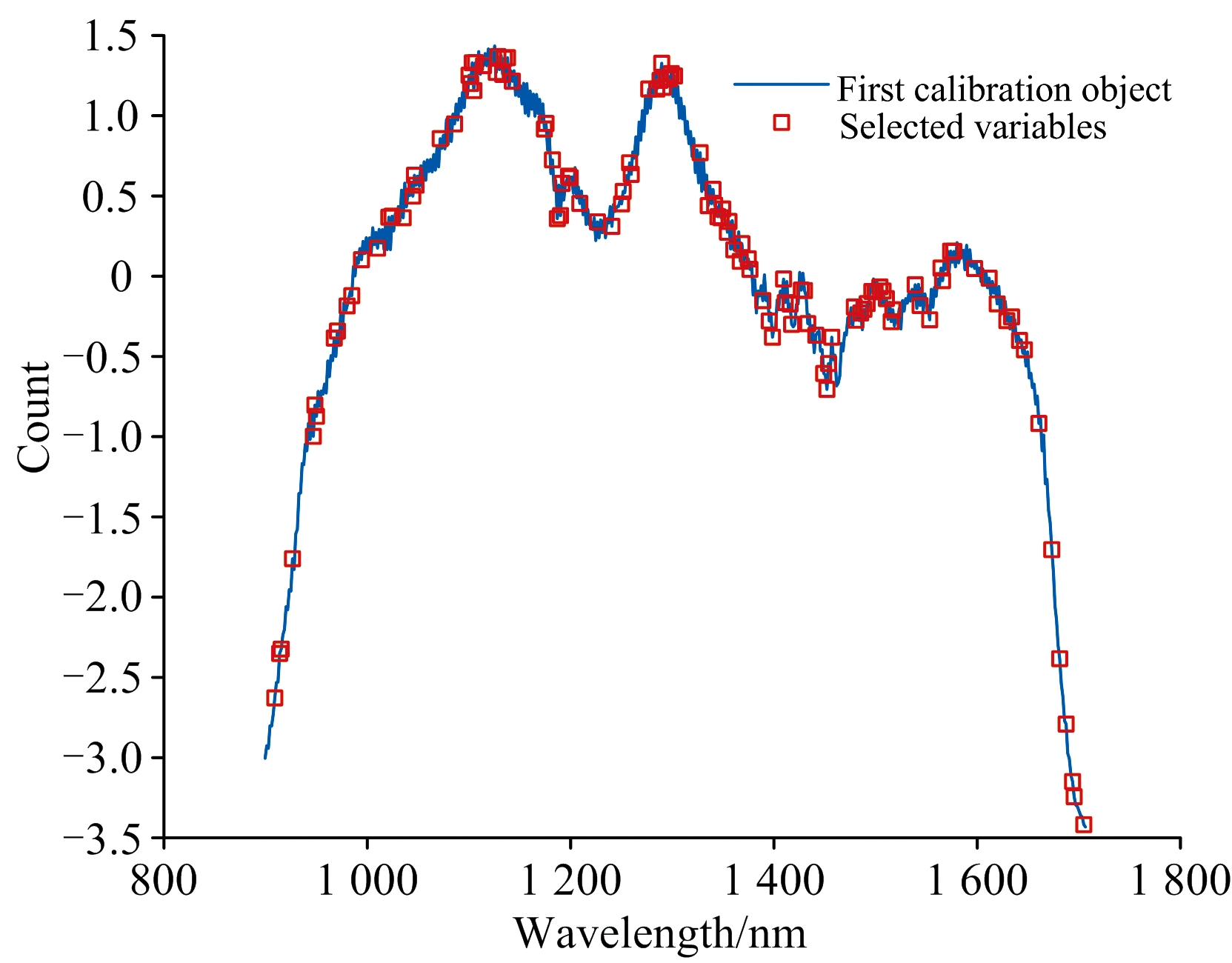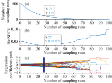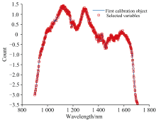 竞争性自适应重加权(CARS)算法的蒙特卡洛采样次数设定为100次, 采用5折交叉验证提取特征波长, 图8所示的是CARS算法提取特征波长过程。 图8(a)表明CARS提取的特征波长数量随采样次数增加呈现先急剧下降后平缓减少的趋势, 体现了特征波长由粗选到精选的过程; 图8(b)显示迭代初期由于无用信息波段被剔除, 交叉验证均方根误差(RMSECV)快速下降, 当采样次数达到27次时RMSECV达到最小值, 随后由于部分有用信息被剔除, RMSECV呈现整体上升趋势; 图8(c)表明在第27次采样时RMSECV值最小, 此时共提取出119个特征波长如图9所示。 结果表明CARS能筛选出高质量特征, 有效去除冗余和噪声。 CARS过程本身就会剔除那些与吸水率相关性不高的波长点, 这在一定程度上也削弱了表面界面氧化的影响。