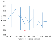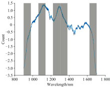 区间组合优化(ICO)算法基于光谱数据的局部特征差异, 将整个光谱区间划分为多个子区间, 每个子区间包含一定数量的连续波段。 通过对不同区间组合的分析和评估, 筛选出对目标分析物具有高相关性和低冗余性的区间组合, 从而实现光谱数据的降维和关键信息的提取。 区间组合优化算法的过程和结果如图10和图11所示, 图11中灰色标注区域即为筛选得到的特征波长区间。 图10数据表明, ICO降维后保留255个特征, RMSE降至0.06的最小值, ICO作为区间优化算法, 过于侧重区间优化, 保留的255个特征存在信息冗余, 无法很好突出与目标强相关特征, 影响数据对模型的支持效果。