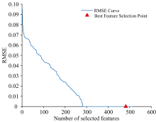 连续投影(SPA)算法的过程和结果如图12和图13所示, 数据表明, 随着特征波段数量的逐步增加, RMSE值呈现匀速下降的变化趋势, 最终确定的特征波段数量为482个。 图中橙色标注区域即为筛选得到的特征波段位置。 SPA降维后保留482个特征, 数量过多, 引入大量弱相关特征, 增大数据稀疏性与噪声影响, 未能有效提取有价值信息, 导致测试集效果不如未降维前数据。