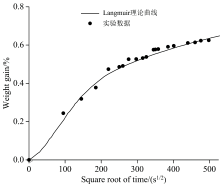 经典的Fick扩散模型仅考虑浓度梯度和热运动, 难以充分描述水分与高分子链之间通过氢键产生的吸附作用。 因此引入描述固体表面层吸附的Langmuir扩散模型以揭示硅橡胶中水分的非Fick扩散过程。 图3为硅橡胶试样在恒温水浴箱中浸泡时的重量增加曲线和Langmuir扩散模型的理论曲线。 同时可以看出, Langmuir扩散模型可以很好的描述试验结果。