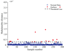 由于硅橡胶试片在数据采集过程中会存在漏光、 光源强度发生变化以及异常检测点干扰等因素产生异常数据, 这将对硅橡胶试片的含水量回归模型的预测性能、 鲁棒性与适用性产生较大地影响。 通过对原始数据进行异常样本剔除, 可以剔除掉因采样时环境干扰等原因产生的样本相关性弱的问题, 减少对后续实验的干扰并提升模型训练精度。 故分别使用局部异常因子算法(local outlier factor, LOF)和马氏距离算法(Mahalanobis distance, MA)对原始数据进行异常样本剔除。