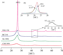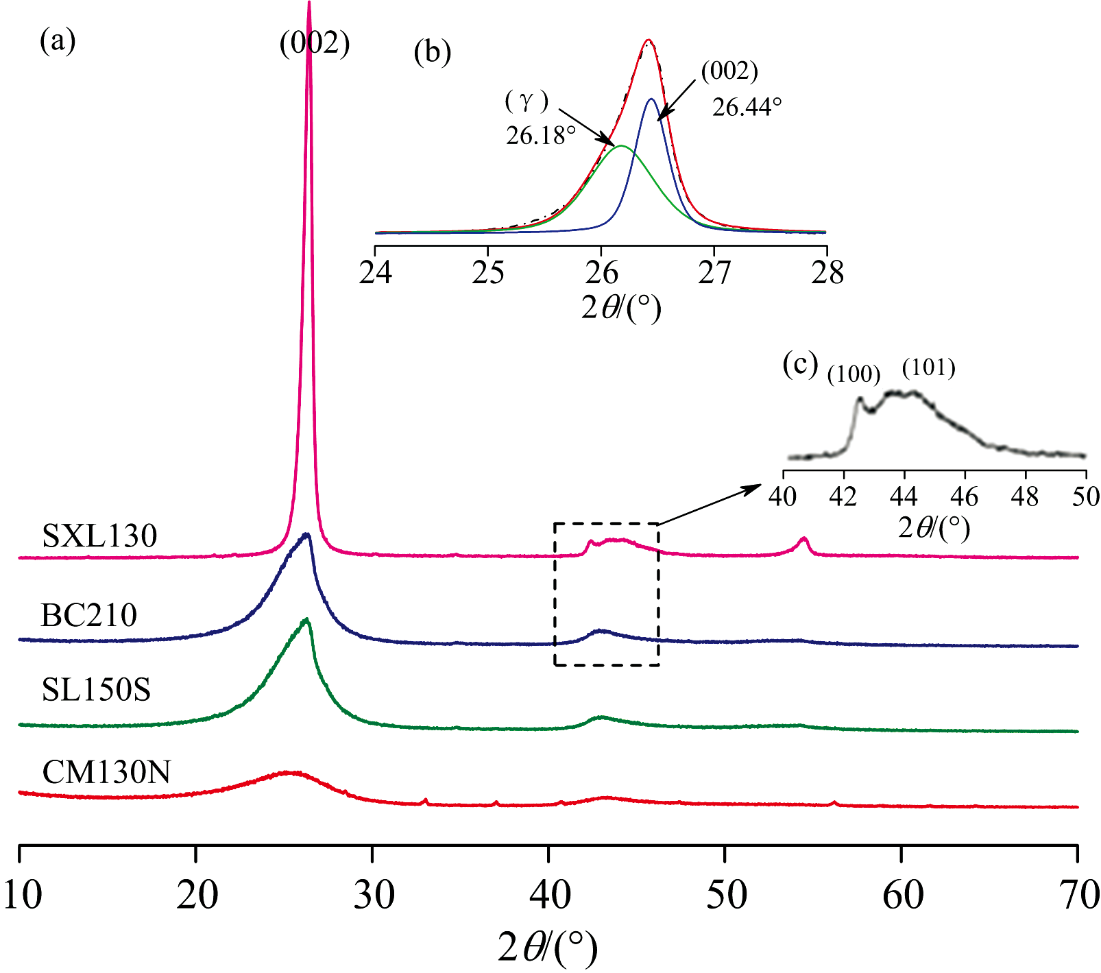 在煤系石墨的XRD谱中[图1(a)], ~26° 2θ 、 ~42° 2θ 、 ~44° 2θ 、 ~54° 2θ 附近分别存在对应石墨晶体(002)、 (100)、 (101)、 (004)晶面的特征峰[5]。 通常认为XRD谱图中~26° 2θ 处的宽缓峰是由(002)峰和γ 带叠加产生[图1(b)], 前者归属于类石墨的微晶结构(或缩聚芳香核), 后者为无定形碳或微晶边缘的脂肪族侧链[6]。 随着变质程度升高, ~44° 2θ 处的叠合峰(10l)分裂为(100)峰和(101)峰[图1(c)], (100)峰变高变窄, 芳香层片尺寸增大, 宽缓的(101)峰是煤系石墨微晶层间配置开始ABAB…规则排列的结果。 (10l)重叠峰的叠合和过度展宽可能是由微晶的大小和形状、 旋转、 微应变和缺陷结构(如堆垛层错)等因素引起[2]。 通过拟合分峰求解子峰峰位、 半峰宽等数据(表2), 并由Scherrer公式和Bragg方程求取芳香层面网间距(d002)、 堆砌度(Lc)和延展度(La)等结构参数, 由Willliamson-Hall方法计算微晶颗粒平均尺寸(crystallite size, Dsize)以及微观应变(microstrain, ε strain)[7, 8]。 面网间距(d002)在0.347 2~0.336 8 nm 之间, 石墨化度DG在0~0.837之间。 按照煤系石墨鉴定标准[1], CM130N属于高变质无烟煤, SL150S和BC210属于半石墨, SXL130属于煤系石墨。
