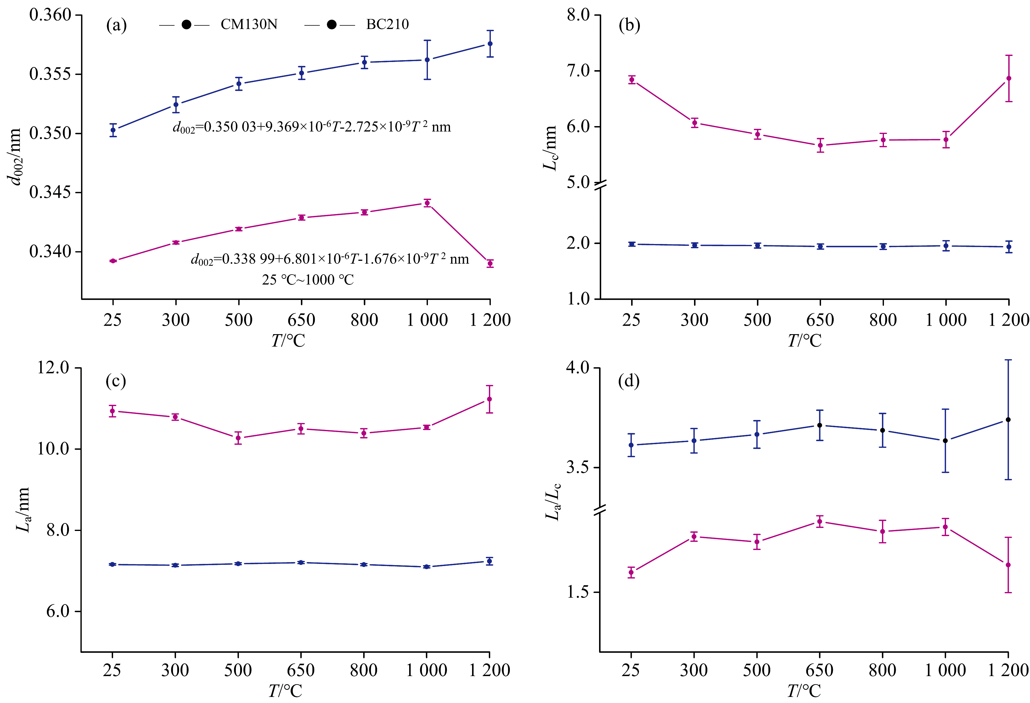 各向异性煤系石墨的热膨胀系数在不同方向上表现出显著差异。 层内碳原子间的键长会随着温度升高(300~1 200 ℃)而增加, 导致层内方向的膨胀, 但高变质无烟煤CM130N的La变化不明显, 可能源于脂肪侧链和含氧官能团的键断裂, 阻碍微晶径向生长, 但半石墨BC210的La呈先减小后增大。 随着温度的升高, XRD谱图中(002)衍射峰向高角度方向移动, 显示层间距离增加, 而XRD谱图的半峰宽变化不明显, 显示微观应变相对较小, 但BC210的Lc表现为先减小后增大, 可能在温度作用下, 微晶重新排列, 沿着c轴方向生长。