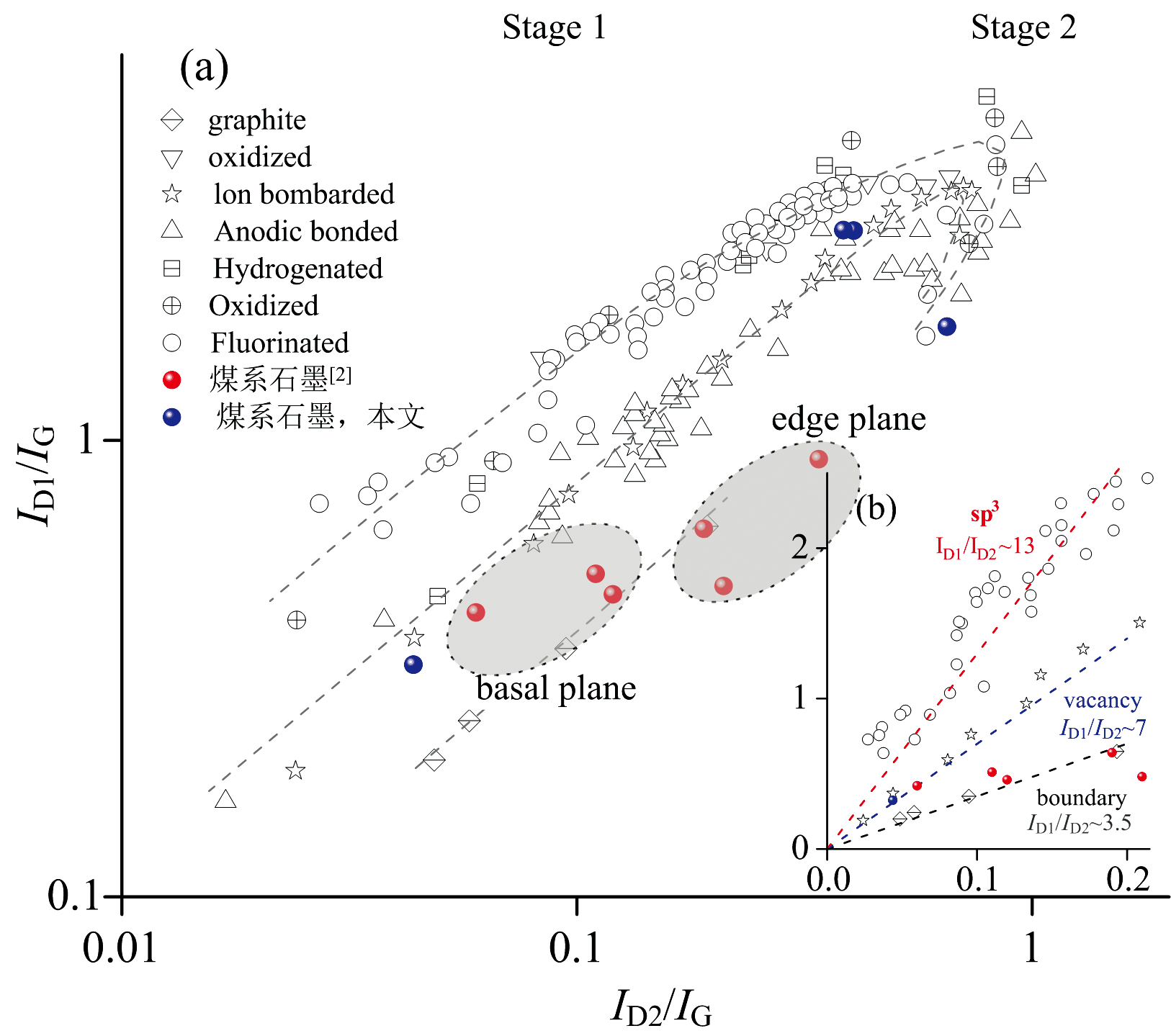 | 图4 用于判别缺陷类型的ID1/IG与ID2/IG比值的关系(据文献[10]修改)Fig.4 The relationship between ID1/IG and ID2/IG ratio for identifying defect types (According to reference [10]) |