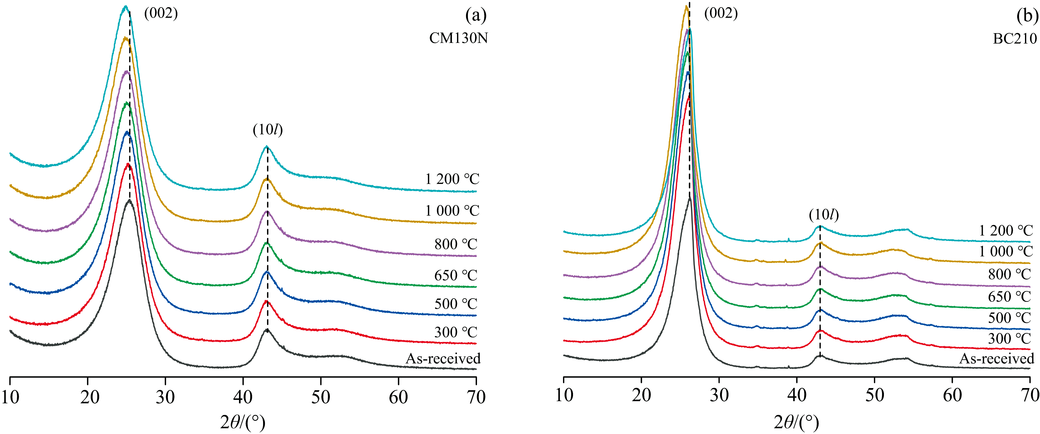 图9为CM130N(石墨化度DG=0)和BC210(石墨化度DG=0.605)在不同温度下(从室温到1 200 ℃)的XRD谱图。 不同温度处理下得到的XRD图谱非常相似, 均显示出典型的非晶炭材料的衍射峰特征。 其中, (002)衍射峰反映了微晶结构中芳香层片在c轴方向的堆叠情况, 峰越窄越高, 表明芳香层片堆叠越规整; (10l)衍射峰则反映了芳香层片的尺寸大小, 峰越窄越高, 说明芳香层片越大。