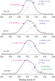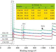 X射线光电子能谱(XPS)信息来自样品表面几个至几十个原子层, 可用来分析煤系石墨表面的元素组成和官能团含量[13, 14]。 为使样品更接近实际情况, 未对煤粉进行脱矿处理。 煤系石墨表面以C、 O为主要组成元素(图5), 还含有少量的N、 S元素。 随着石墨化程度增高, 其表面N、 S元素越低, 尤其是SXL130表面甚至检测不到N元素。
