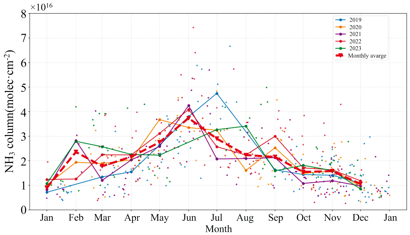 本研究采用的大气氨气柱浓度卫星数据是2019年— 2023年的IASI/NH3 TOTAL COLUMN LEVEL 2 DATA数据产品, 这些数据可以从官方网站(https://iasi.aeris-data.fr/)上获取。