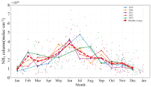 | 图4 2019年— 2023年合肥地区大气氨气柱浓度月均值与整个观测期间月均值Fig.4 Monthly means of atmospheric ammonia column in each year and the cumulative monthly-averaged ammonia column from 2019 to 2023 |
