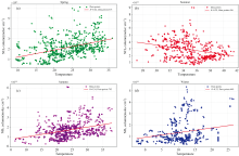 | 图5 春季(a)、 夏季(b)、 秋季(c)、 冬季(d)四季氨气柱浓度与大气温度关系散点图Fig.5 Correlation between ammonia column and air temperature in different seasons: (a) spring, (b) summer, (c) autumn, (d) winter |