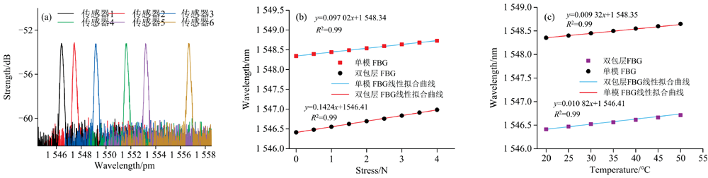 以不同周期相位掩膜板刻写得到6个不同中心波长双包层FBG, 相应反射光谱如图2(a)所示, 依次标记为传感器1~6。 监测手指运动状态之前, 首先测试了双包层FBG和单模FBG传感器的传感性能(以传感器1为例)。 图2(b)显示了双包层和单模FBG反射光谱的中心波长与应力之间的关系。 数据显示, 双包层FBG中心波长与应力的线性拟合曲线函数为y=0.142 4x+1 546.41, 灵敏度为142 pm· N-1, 拟合系数R2=0.99。 相同测试条件下, 单模FBG中心波长与应力的线性拟合曲线函数为y=0.097 02x+1 548.34, 灵敏度为97 pm· N-1, 拟合系数R2=0.99。 图2(d)显示了双包层和单模FBG中心波长与温度之间的关系。 从图中可以得到, 双包层FBG反射光谱中心波长与温度的线性拟合曲线函数为y=0.010 82x+1 546.41, 灵敏度为10.8 pm· ℃-1, 拟合系数R2=0.99。 对应单模FBG反射光谱中心波长随温度的线性拟合曲线函数为y=0.009 32x+1 548.35, 灵敏度为9.1 pm· ℃-1, 拟合系数R2=0.99。 对比可知, 双包层FBG的应力灵敏度明显高于普通单模FBG。 这主要是因为, 相较于单模FBG, 双包层FBG拥有更小的光弹性系数和更大的纤芯直径, 这使其对微小应力变化更敏感[20, 21, 22], 表明双包层FBG可以更好的满足传感的要求。